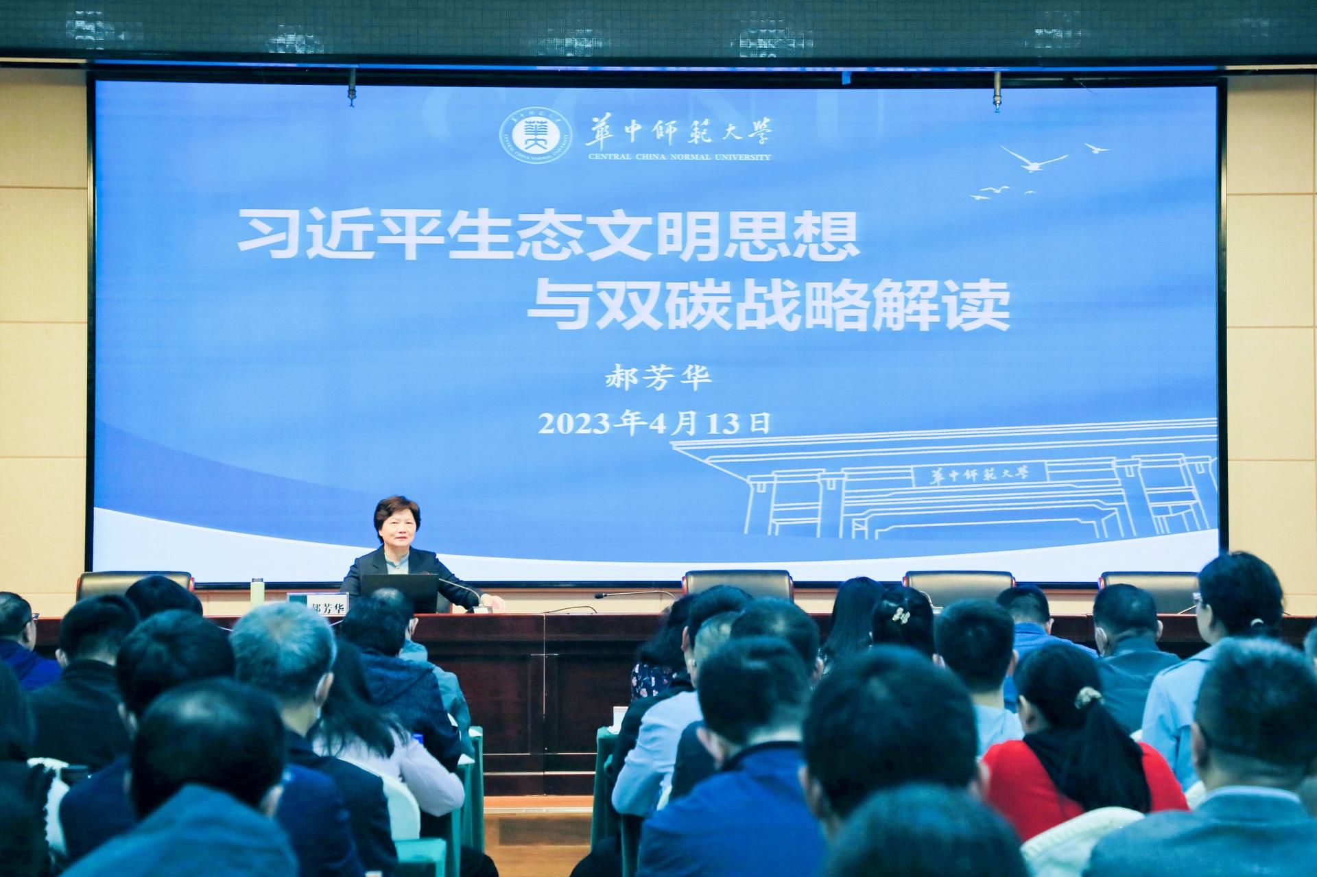 郝芳华在报告中结合自身学习、工作经历,以深刻的阐述、鲜活的案例深入解读了习近平生态文明思想的发展历程、主要内涵、重大意义和鲜明特色,详细介绍了双碳目标的战略意义、现实挑战、实践路径、热点趋势。在互动交流环节,郝芳华就学员提出的相关支持政策、双碳人才培养等问题作了精彩的解答,并热情邀请大家在今年金秋时节再回桂子山共庆华师120周年华诞。