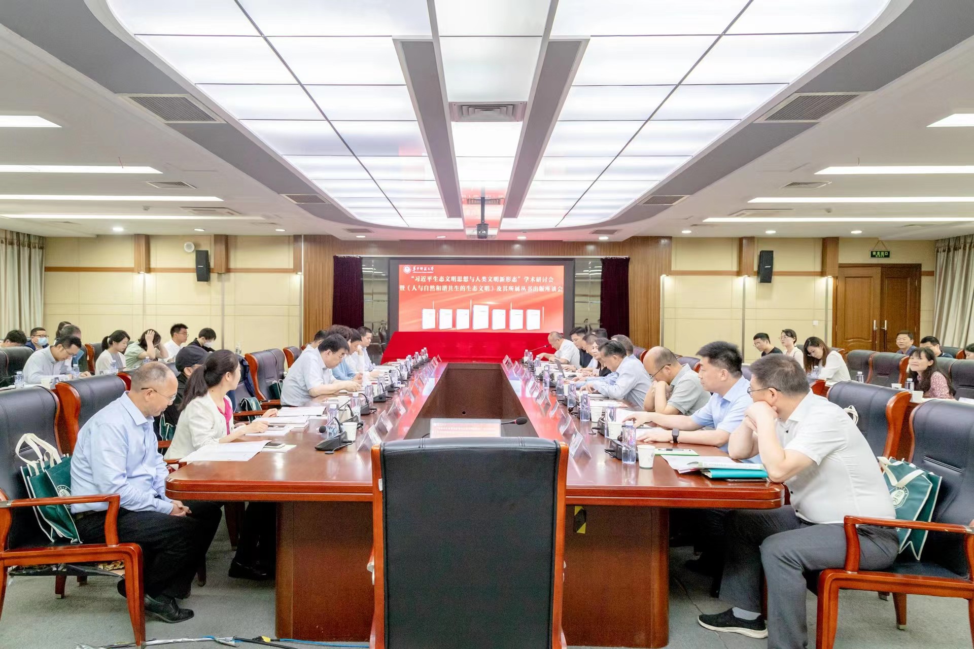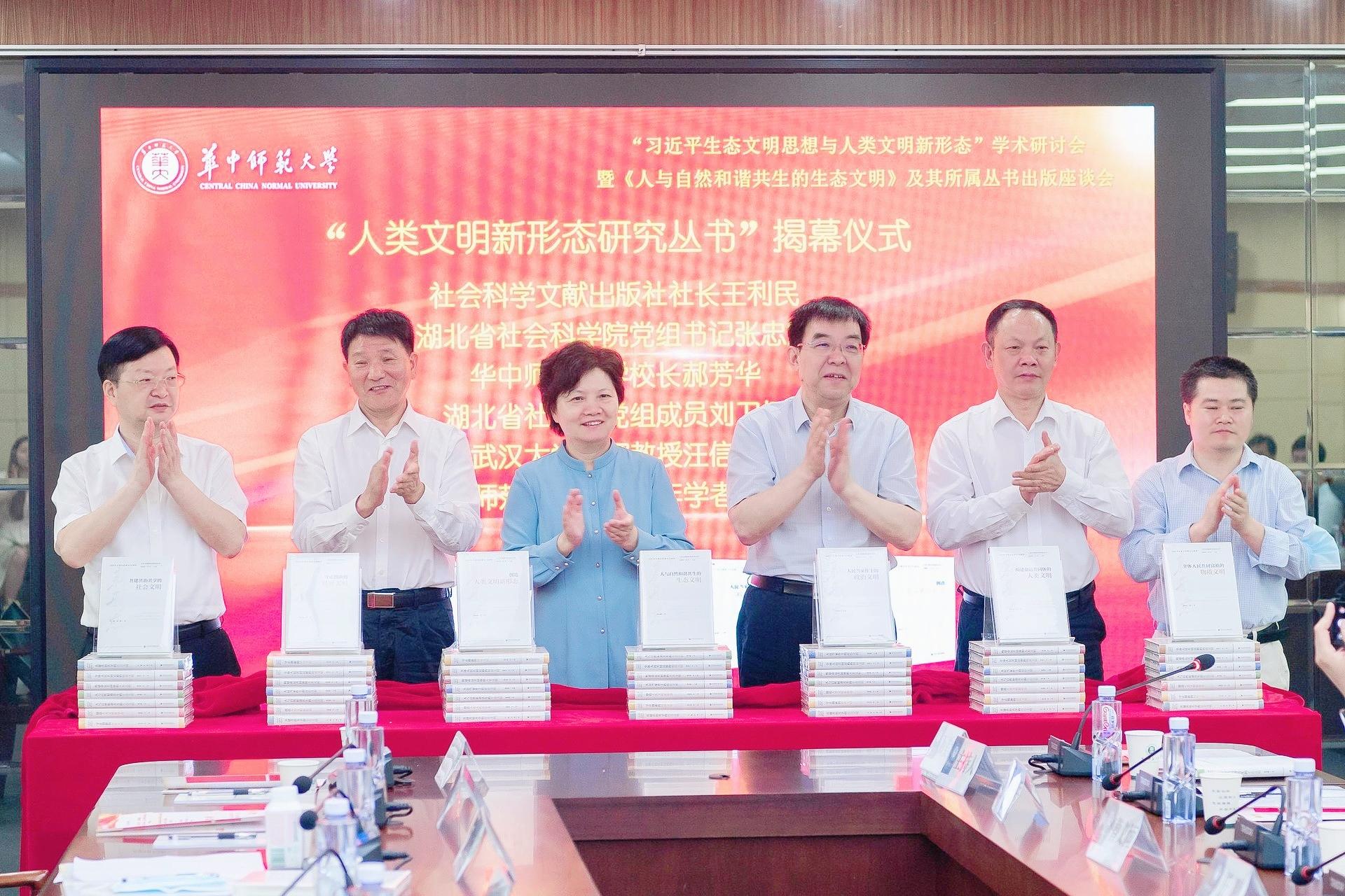 在“人类文明新形态研究丛书”揭幕仪式上,校长郝芳华、社会科学文献出版社社长王利民、湖北省社会科学院党组书记张忠家、湖北省社会科学界联合会党组成员刘卫桥、武汉大学资深教授汪信砚、我校桂子青年学者戴圣鹏等共同为新书揭幕。在学术研讨阶段,与会专家学者围绕“习近平生态文明思想与人类文明新形态”主题,就习近平生态文明思想、人类文明新形态、中国式现代化与人类文明新形态、人类命运共同体与人类文明新形态、人类文明新形态与全球文明倡议、“人类文明新形态研究丛书”之出版价值等方面内容进行了深入探讨。