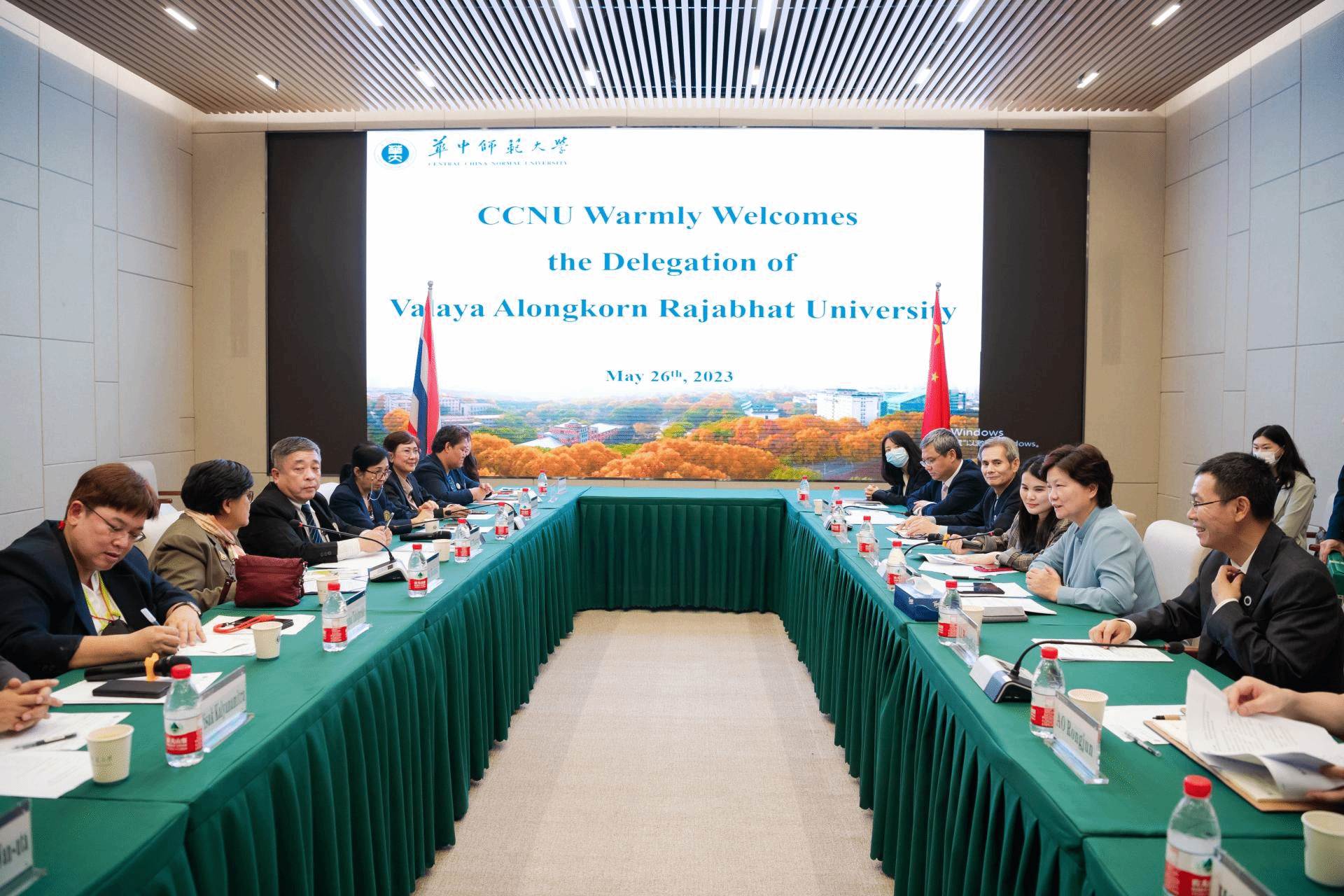 华大在线讯(记者 毛军刚)5月26日,泰国瓦拉亚隆宫皇家大学校长Sombat Kotchasit一行访问我校。校长郝芳华、副校长李鸿飞在文科楼(一期)一楼会议室会见了来访团组。