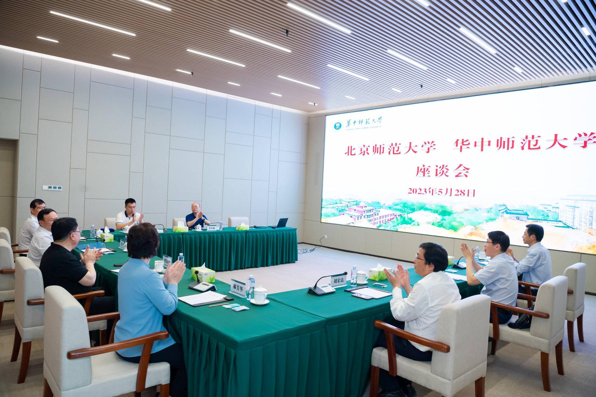 华大在线讯(记者 毛军刚)5月28日,北京师范大学党委书记程建平一行来校调研。校党委书记夏立新、校长郝芳华、校党委副书记陈迪明在文科楼一期一楼会议室同对方进行座谈交流。