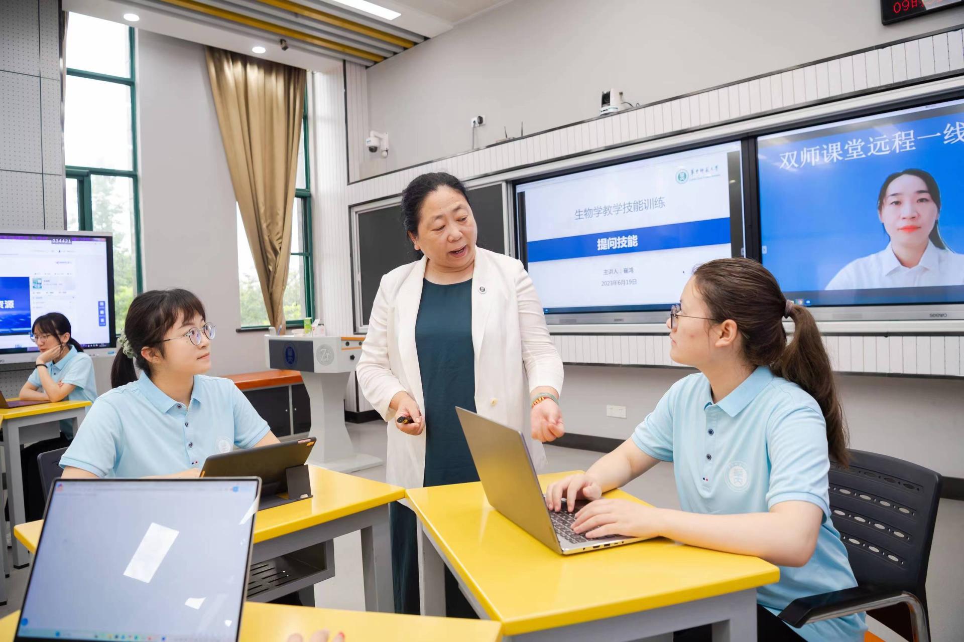 数字化助“教”,技术赋能,创新发展。《等高线地形图数字化教学资源开发》课程运用国家智慧教育平台上的国家级一流本科课程《现代信息技术与中学地理教学》资源,通过自主设计的虚拟仿真实验、地理AR沙盘等信息技术,让学生在这个“翻转课堂”上,更真实、更主动地进行地理教学技能训练。在《生物学教学技能训练》课堂上,同学们不仅可以依托“小雅平台”完成理论知识自学、模拟试讲和教学反思,还可以通过高校生物学教学论教师和一线高中生物学教师的“双师”协作指导,突破“问题链设计”这一教学难点。