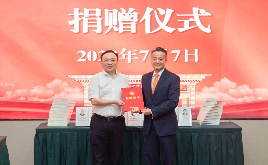 夏立新向北京崇学文化发展有限公司总经理余富文颁发捐赠证书并表达诚挚谢意。夏立新回顾了我校一百二十年的红色根脉,并表示,此次捐赠对全校师生深入学习贯彻习近平新时代中国特色社会主义思想、进一步推进学校主题教育深入开展具有重要意义。学校将发挥多语种学科和学术优势,深入研究、阐释、宣传《习近平谈治国理政》,为讲好中国故事、传播中国声音,贡献华师人的力量。