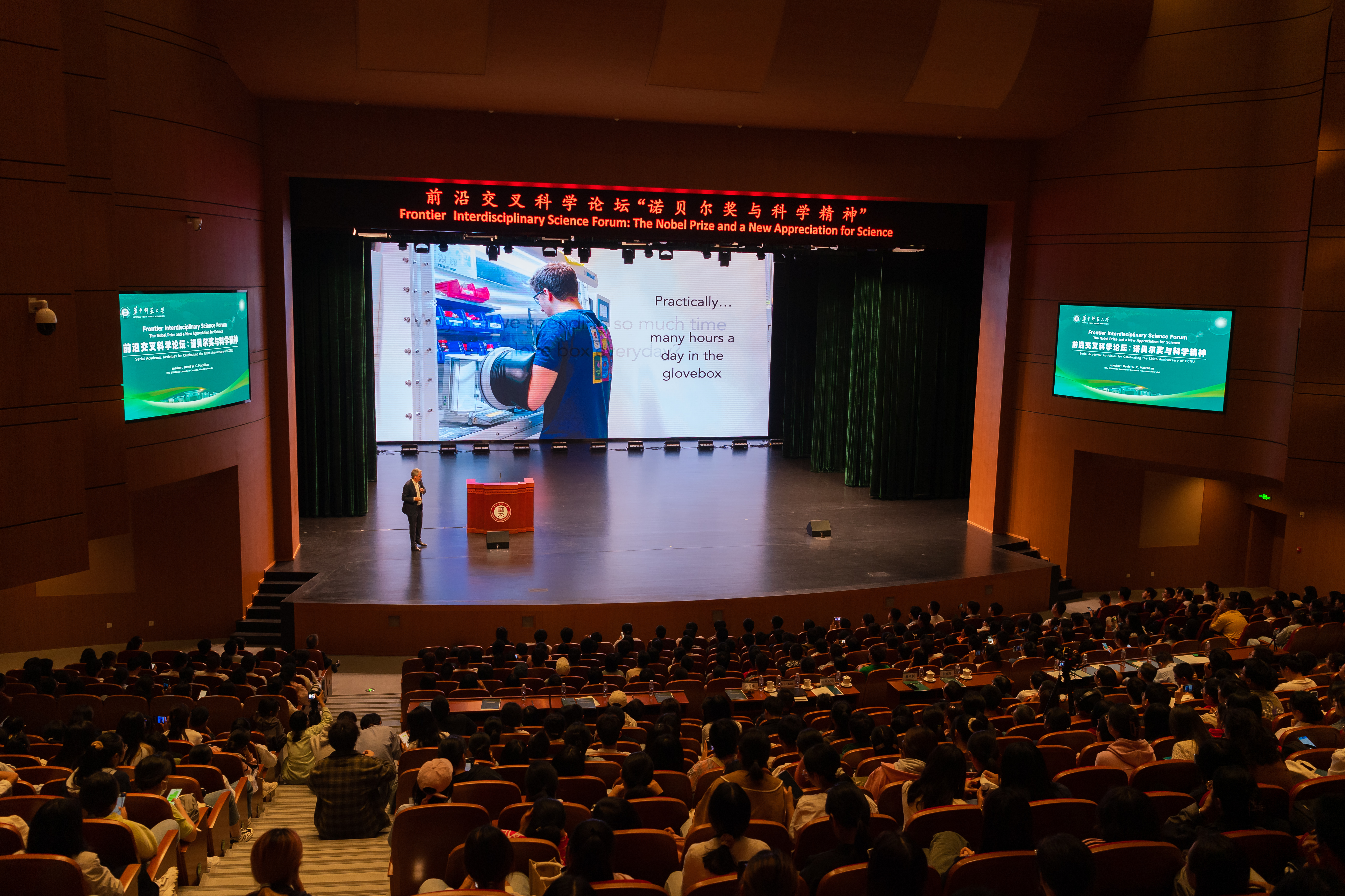 报告结束后,同学们纷纷自发上台与戴维·麦克米伦教授交流、拍照。戴维·麦克米伦教授非常感谢同学们的热情,并向现场观众展示了诺贝尔奖章。最后,在大家热情的邀请下,戴维·麦克米伦教授与现场全体师生合影。同学们表示,有机会接触到享誉世界的杰出科学家,聆听学术见解,感受科学精神和创新思维,对进一步培养对科学的兴趣、激发探索科学的热情有着极其重要的意义。