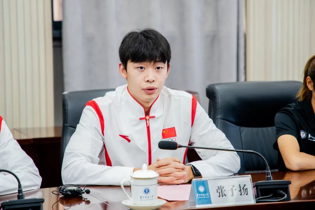 交流发言阶段,体育学院主要负责人介绍了学院在近年来学术融合、高水平运动队建设等方面的举措和探索。世界大运会参赛选手、体育学院2022级体育教育专业本科生罗霞和2022级体育教育专业本科生吴洪娇分享了各自参赛体会与返校感想。