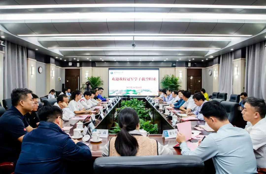 华大在线讯(记者 郝日虹)10月16日,校党委书记夏立新、校长郝芳华、副校长彭双阶等与张子扬、陈佳鹏等我校冠军学子在行政楼一楼会议室座谈,向他们载誉归来表示祝贺,为他们在杭州第19届亚运会赛场上奋力拼搏、为国争光、为校添彩“点赞”。