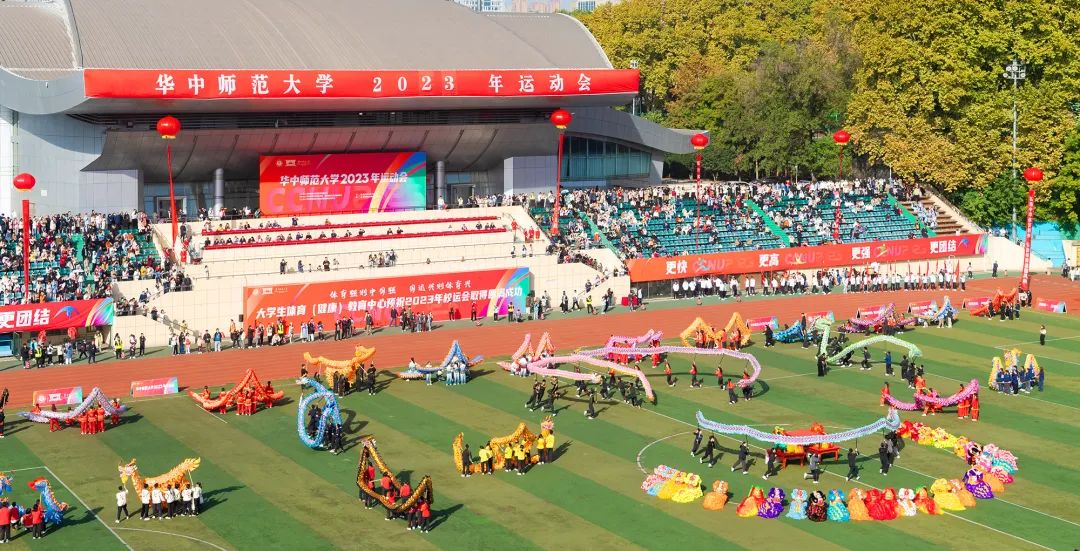 随着两只威武的狮子越入场中,摇头摆尾大展拳脚,团体操舞龙舞狮表演拉开序幕。身着红色或黑色服装的舞者扛起龙身,迈着整齐的步伐,让一条条色彩斑斓的巨龙遨游天际。大龙静有神威,小龙动若流云,场上群龙共舞。众狮憨态可掬,穿梭其间。体育场上色彩缤纷,华师学子神采飞扬。