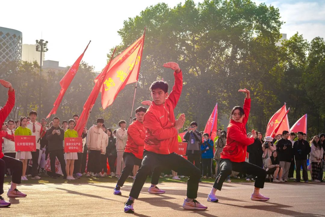 开幕式上,各代表队身着各学院特色服装,迈着铿锵有力的步伐,依次亮相。少数民族预科班代表队身着民族服饰,载歌载舞,热情洋溢;校医院的工作人员手举“急救先锋、守护生命”的标语,承诺在运动会期间做好运动员的坚实后盾;“知华、友华、爱华”,国际交流学院学子热情地挥舞各国旗帜,尽情表现对华师的热爱;跳跃、转体、后空翻,音乐学院学子以婀娜但不失力量感的舞姿展现体育魅力……各具特色的方阵表演让现场掌声不断。