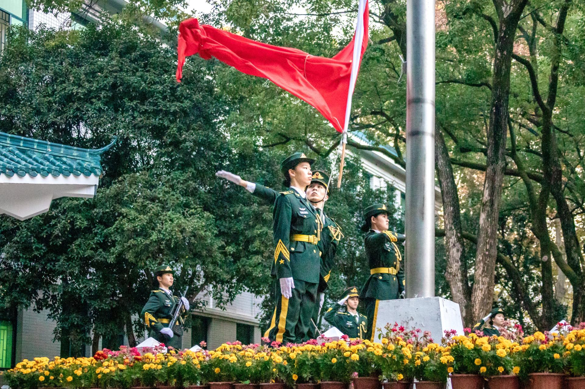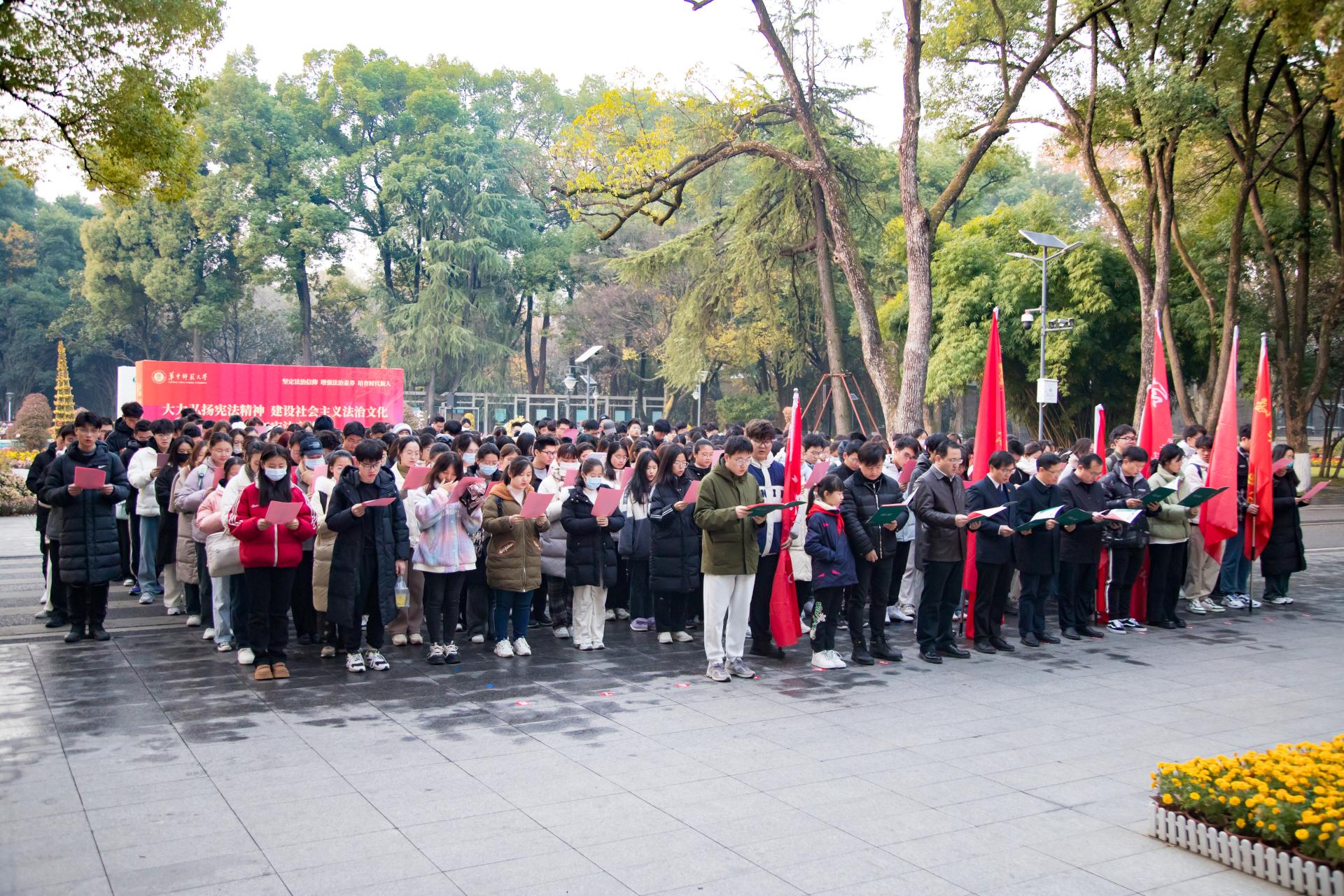 华大在线讯(通讯员 杨盼盼 肖扬)12月4日,我校在文华公书林举行“国家宪法日”升旗仪式暨“宪法晨读”活动,副校长任友洲出席并致辞,相关职能部门负责人和二级学院师生代表参加活动。