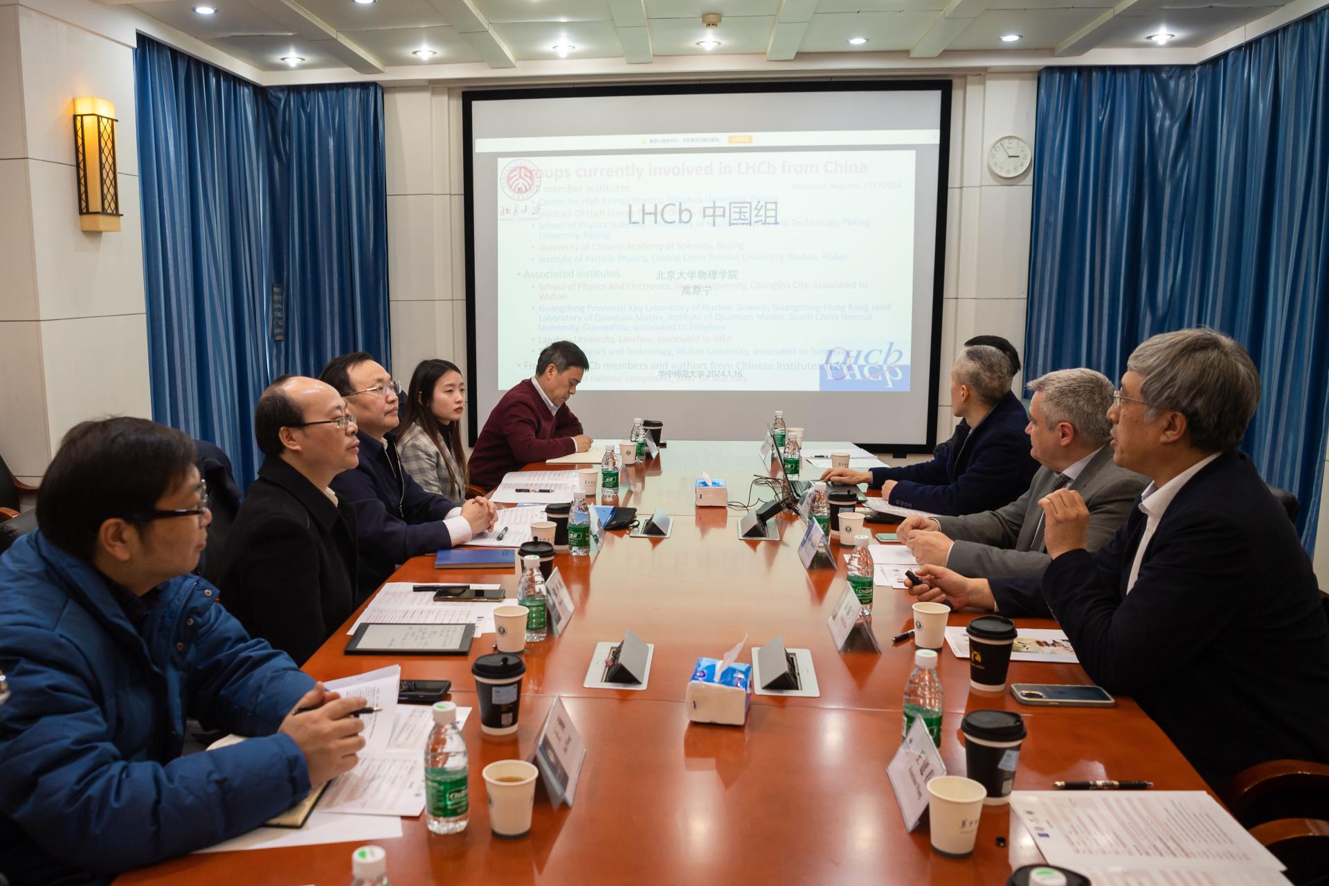 华大在线讯(通讯员 尹航)1月16日,欧洲核子研究中心—北京大学—中国科学院高能物理研究所—开云网页版登录入口粒子物理合作会谈在校举行。欧洲核子研究中心(CERN)LHCb国际实验组发言人文森佐.瓦尼奥尼博士、北京大学物理学院院长高原宁院士、校党委书记夏立新、中国科学院高能物理研究所实验中心副主任王建春研究员出席。科技处、国际合作与交流处、物理科学与技术学院负责人和粒子物理研究所相关人员参加会谈。
