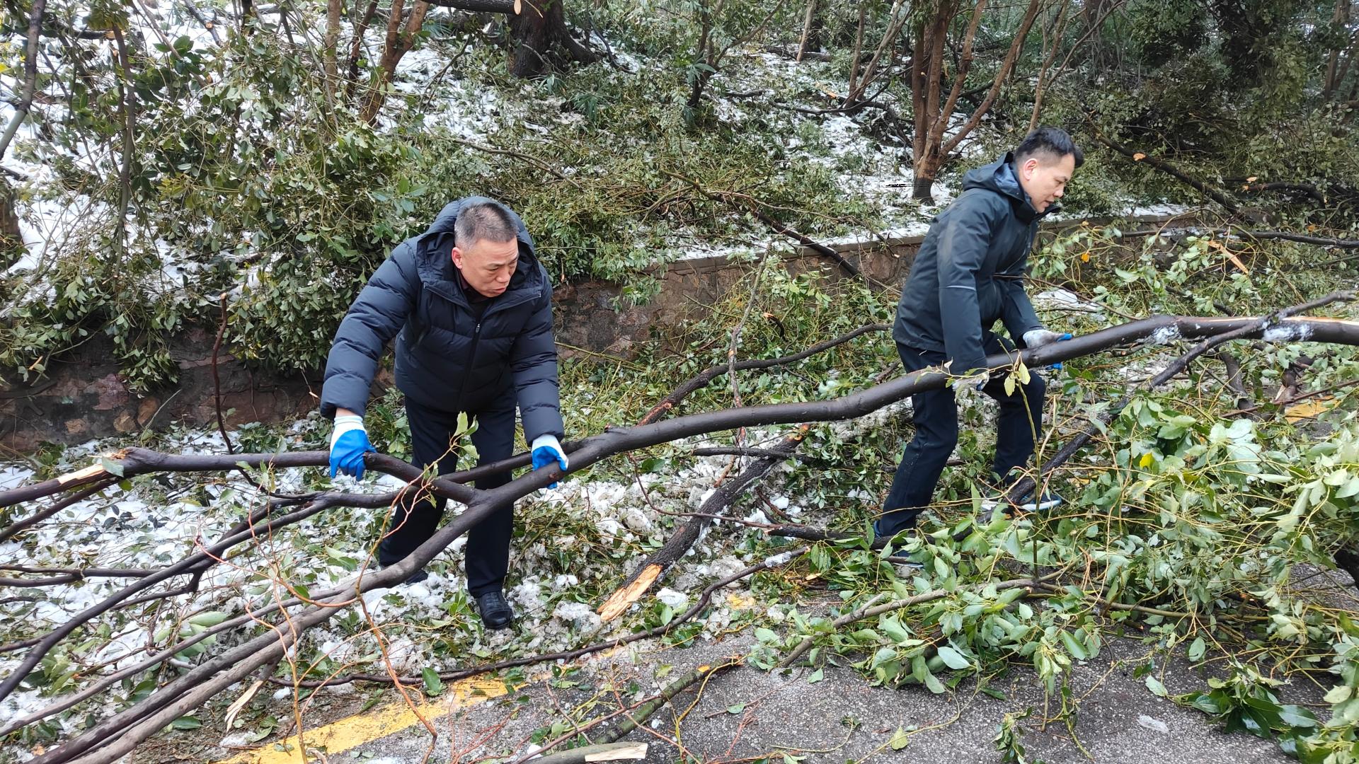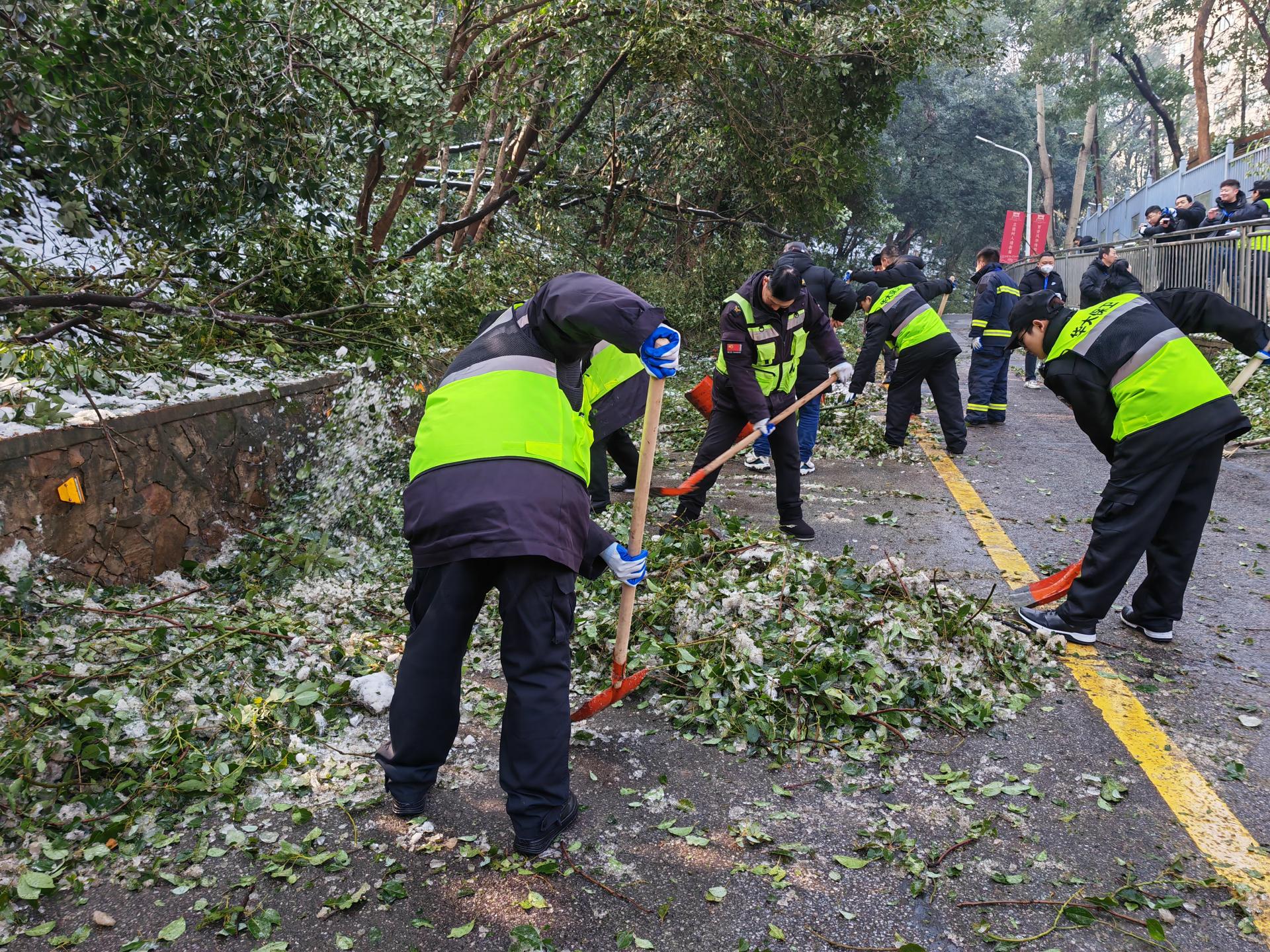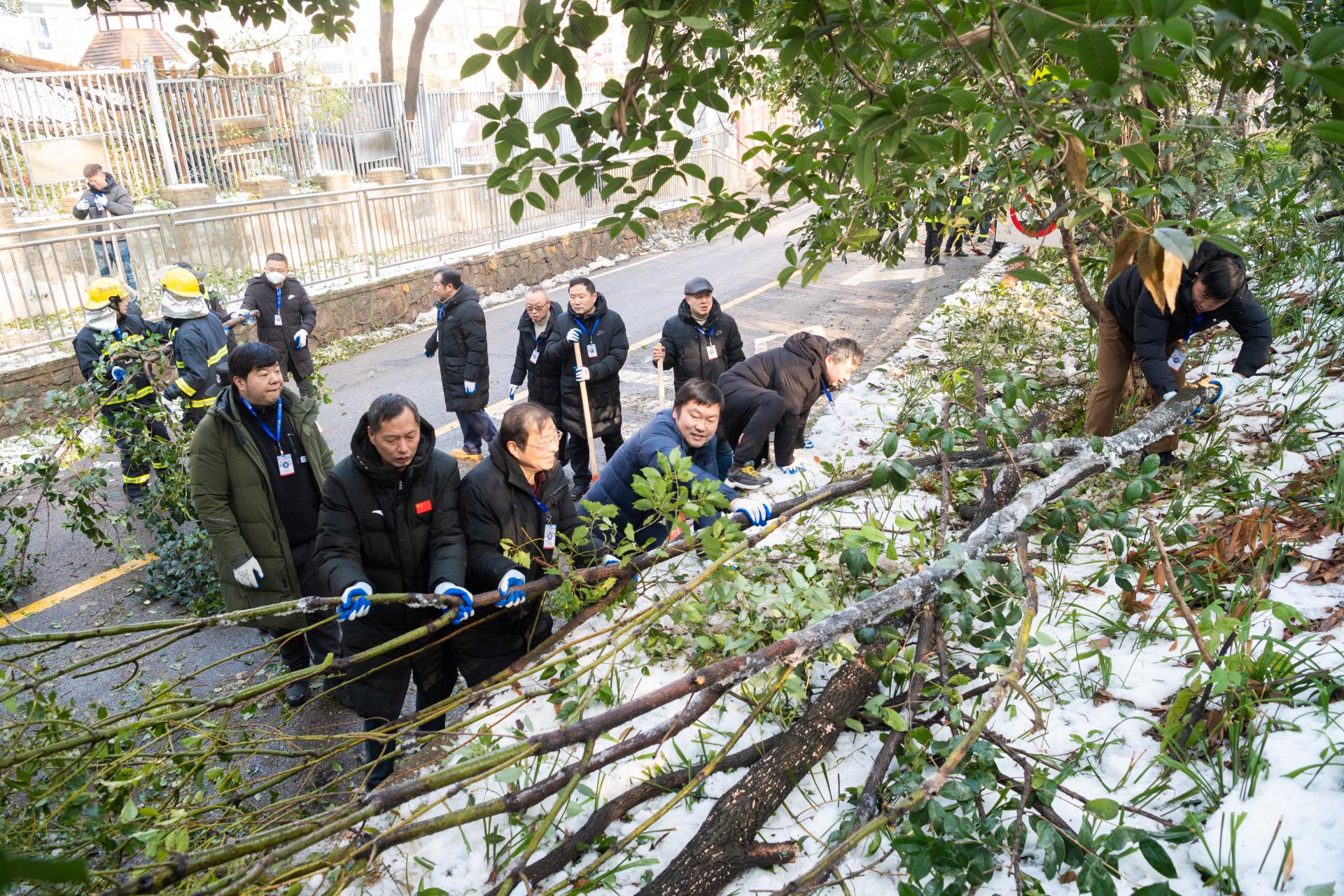 尽管树上不时有冰碴掉落,清理现场却一片火热。在一声声加油鼓劲声中,50余名保卫部(处)突击队及志愿者分成三组,把倒在路上的树干锯断,拖到路边,再将树干树枝装上卡车拖走。经过数小时忙碌,环山北路两边被折断的树干树枝全部清理完毕,此前因折断树木变成的“单行道”恢复顺畅通行。