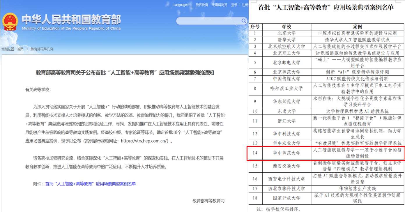 为深入贯彻落实国家关于开展“人工智能+”行动的战略部署,积极推动高等教育与人工智能技术的融合发展,利用智能技术支撑人才培养模式的创新、教学方法的改革、教育治理能力的提升,教育部高等教育司组织了首批“人工智能+高等教育”典型应用场景案例的征集和论证工作,寻找、发掘和推广在人工智能技术应用上具有代表性、前瞻性且能够产生积极影响的高等教育实践案例。自此次案例征集启动以来,我校积极响应,信息化办公室迅速开展校内遴选工作,并推选优秀案例参加。经过教育部专家评审,最终确定首批“人工智能+高等教育”应用场景典型案例名单。