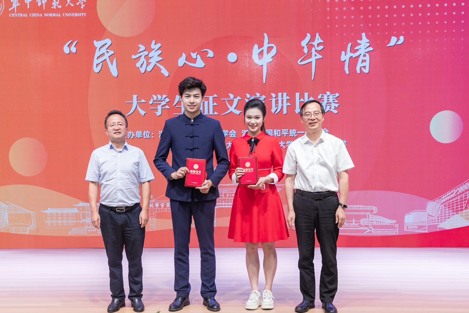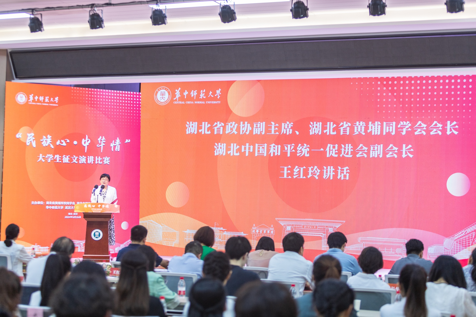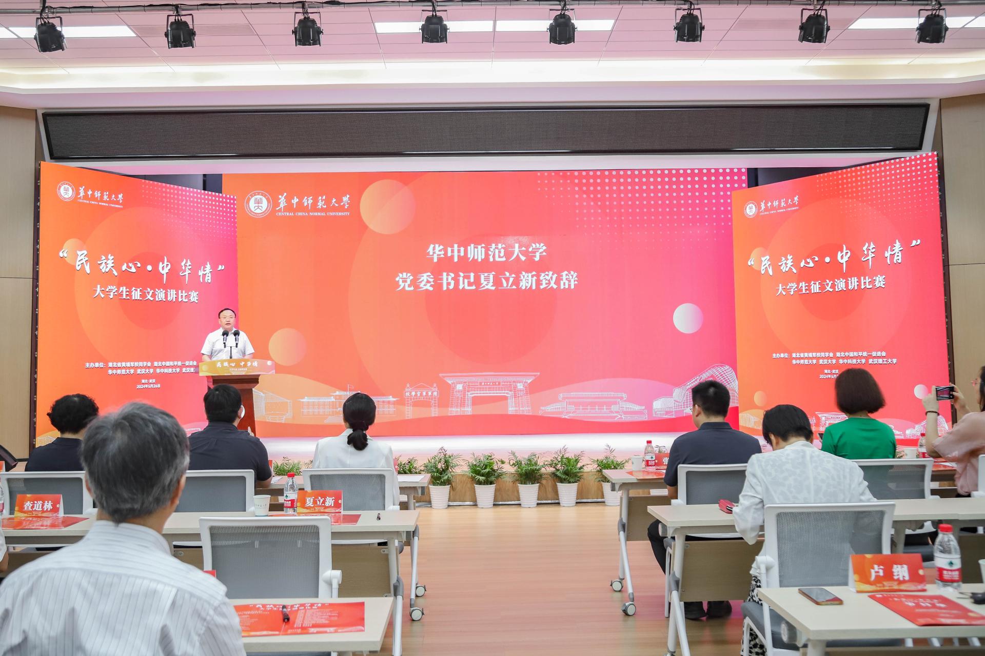 华大在线讯(记者 黄妍妍 实习记者 于继泓)5月26日,“民族心·中华情”大学生征文演讲比赛决赛在老年活动中心五楼演播厅举行。湖北省政协副主席、湖北省黄埔同学会会长、湖北中国和平统一促进会副会长王红玲,湖北省委统战部副部长江浩,湖北省黄埔同学会专职秘书长秦辉、校党委书记夏立新,校党委副书记查道林等出席。