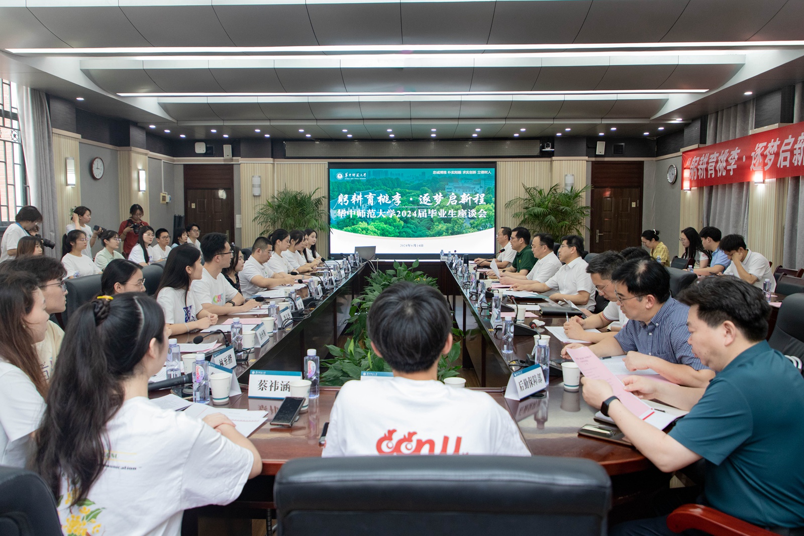 华大在线讯(记者 卫琼雨)6月14日,2024届毕业生座谈会在行政楼一楼会议室举行,校党委书记夏立新、校长彭双阶、校党委副书记陈迪明出席。相关职能部门负责人、学院(学部、中心)本硕博毕业生代表参加。座谈会由陈迪明主持。
