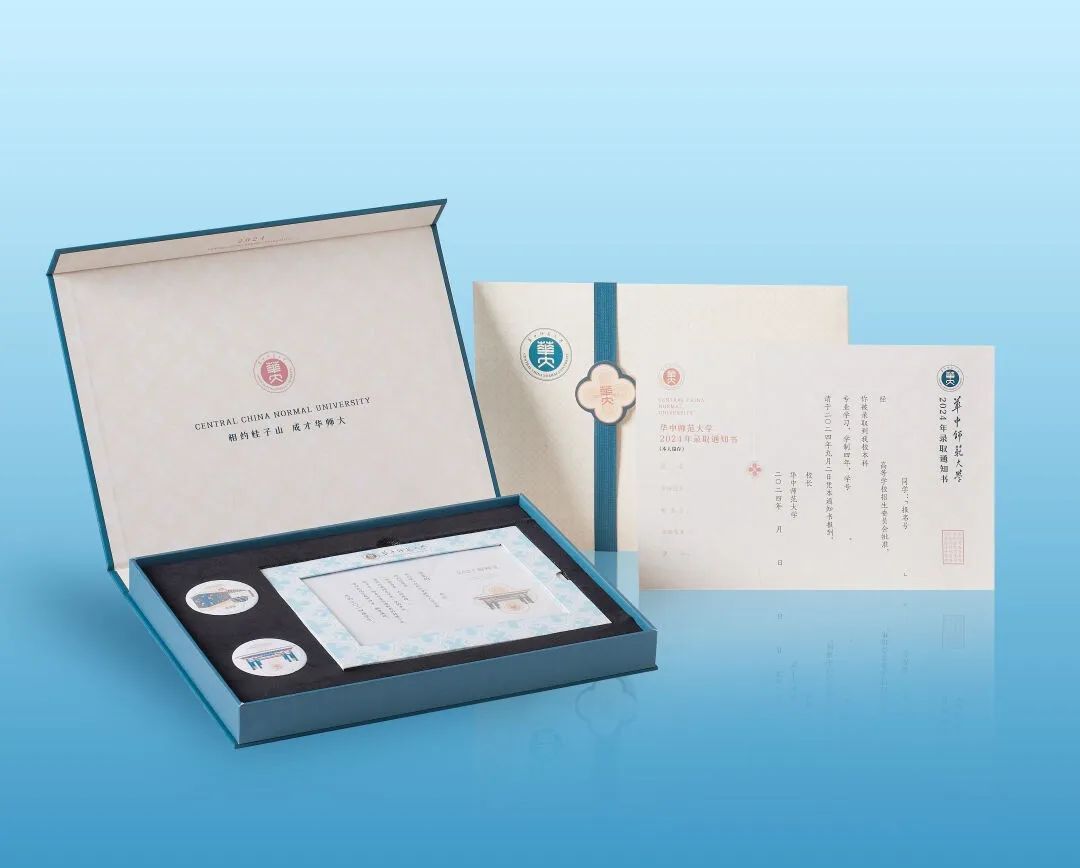我校2024年本科录取通知书专门设置了线上线下联动的“谢师”活动,引导新生向自己的授业恩师表达感谢,成为引领更多新同学树立从教志向,勇担“教育强国”大任的生动思政课,具有浓郁的育人属性。通知书还设计了本科招生专属桂花纹样,用四层不同形状的花瓣,代表“忠诚、博雅、朴实、刚毅”的华大精神。精心定制的校园地标徽章盲盒,给新生暗藏了一份惊喜。通知书内页采用竖式排版,传承中华优秀传统文化,突显了学校的历史文化底蕴。