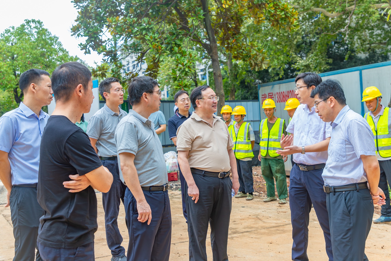 校领导一行向坚守一线的工作人员表示慰问,感谢他们暑期期间辛勤工作、默默奉献,并强调,各工地在高温天气下要强化安全意识,确保工程质量和工程进度,为新学期开学做好准备。