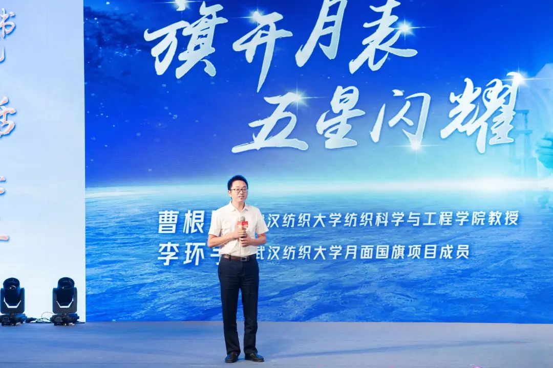 2024年6月,嫦娥六号着陆器携带的五星红旗在月球背面成功展开,这面国旗背后是武汉纺织大学月面国旗项目团队长达数年的创新之路。团队成员李环宇同学为大家现场展示了这面由玄武岩制成的国旗样品,自豪地说“这是我国首次在月球背面独立动态展示的五星红旗,是中国探测器在月球上打上的‘中国标识’!”武汉纺织大学曹根阳教授揭秘了月面国旗背后的故事。历时十余年,无数次实验,冥思苦想,攻坚克难,曹根阳依然觉得很值得,“红旗登月,不仅是对我国载人登月宇航服材料的一次探索,更关乎我们中国人的尊严和荣誉。”“希望让心中闪耀的五星红旗,飘扬在每一个中国人足迹抵达的地方”的期许赢得阵阵掌声。
