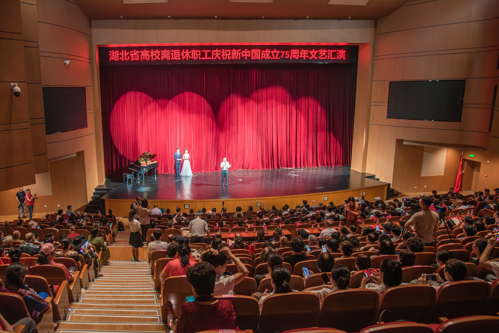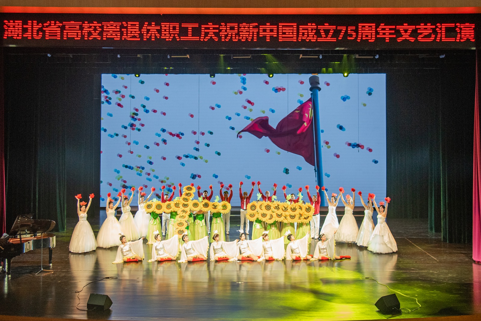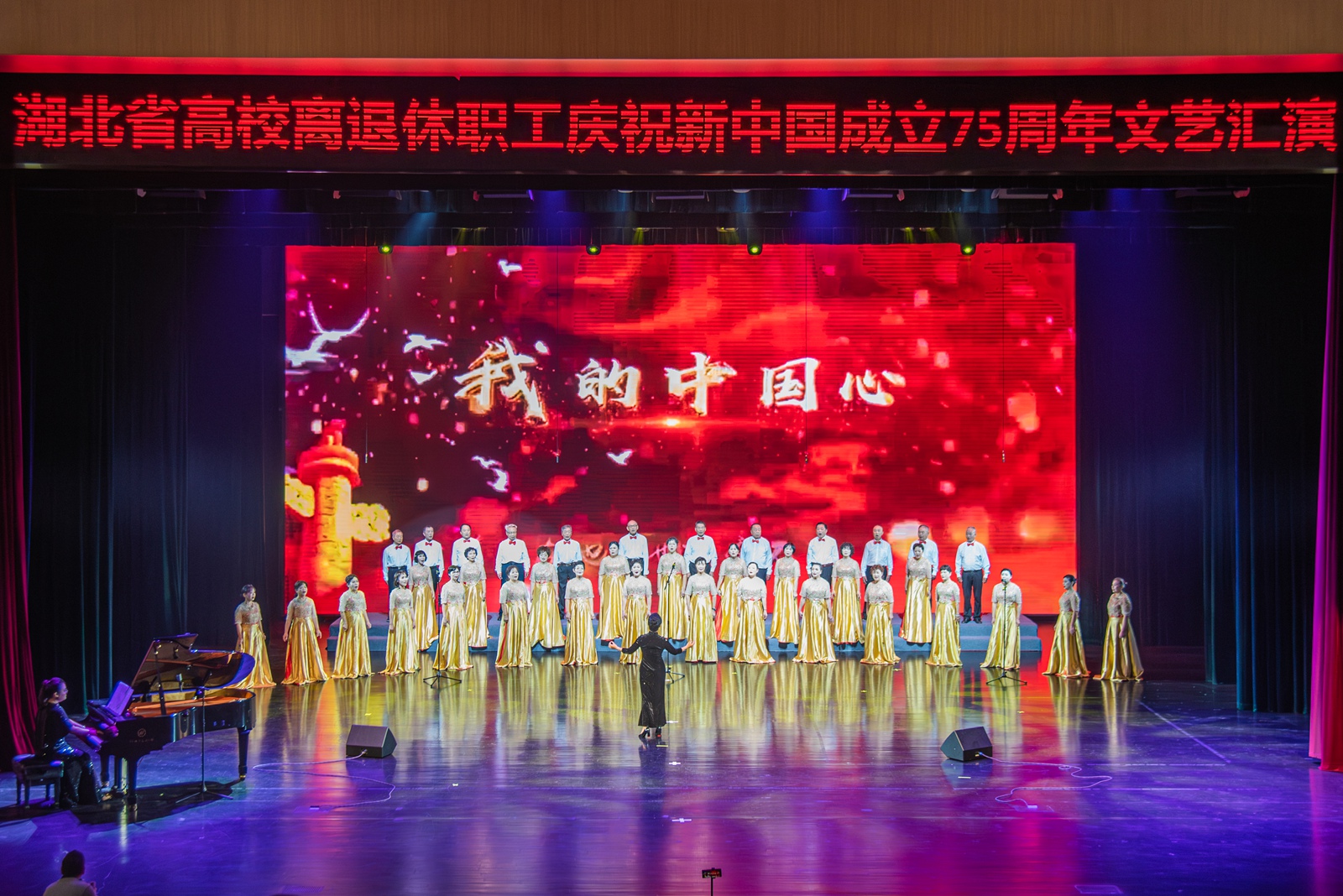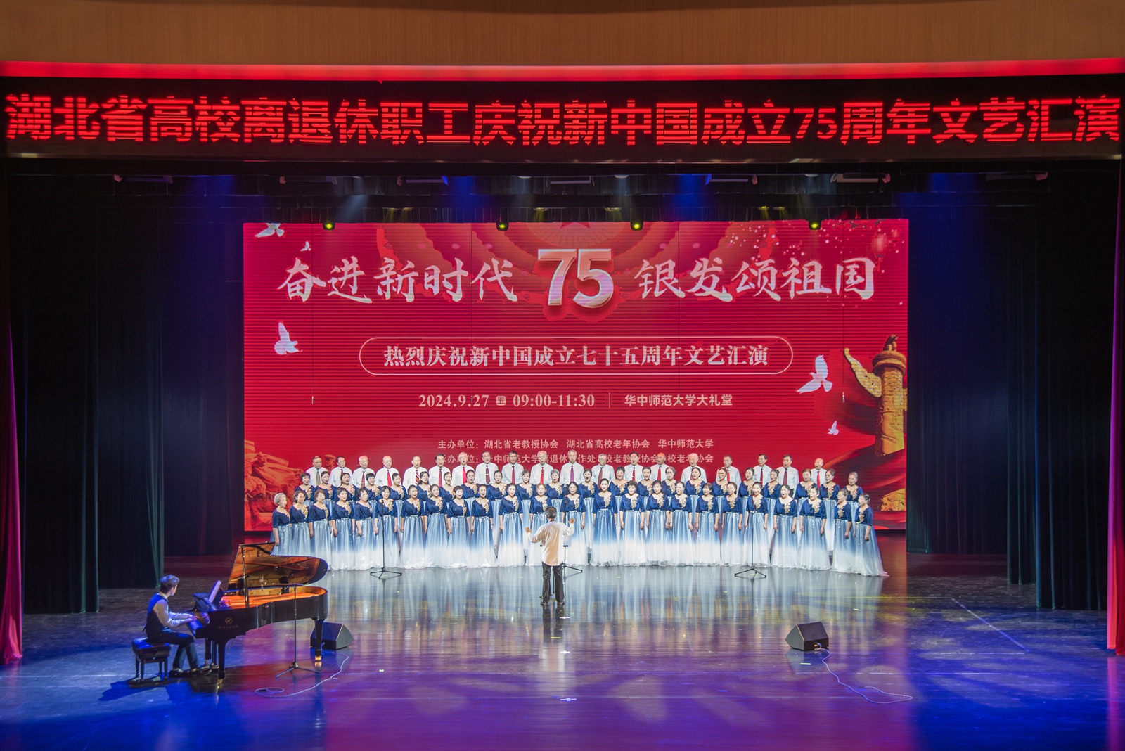 华大在线讯(记者 郑鹏昆 吕雨馨)9月27日,湖北省高校离退休教职工庆祝新中国成立75周年文艺汇演在大学生活动中心大礼堂举行。来自武汉大学、华中科技大学、湖北大学、三峡大学和我校等全省24所高校千余名老同志齐聚一堂,用歌唱、舞蹈、朗诵、时装秀、器乐演奏等形式,展银龄风采,颂繁荣昌盛,献礼新中国75周年华诞。