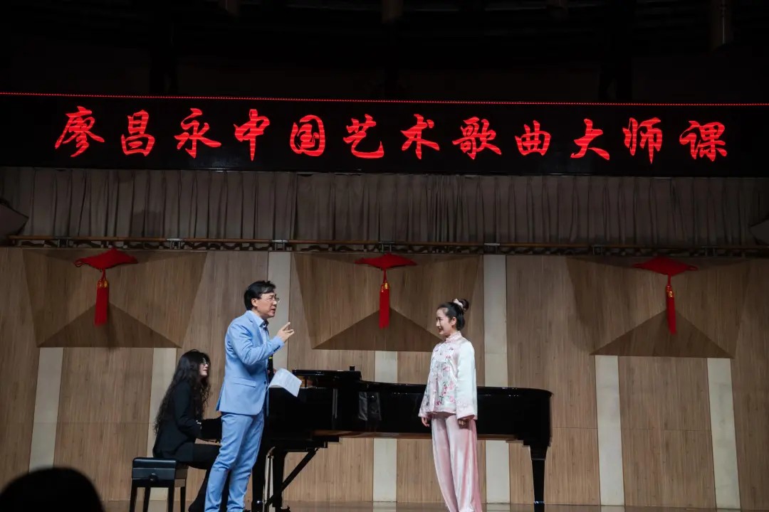 来校期间,廖昌永对我校音乐学院师生进行了中国艺术歌曲声乐专题指导和现场教学。他表示,中国艺术歌曲源自灿若星河的中华文明,蕴含着深厚的文化内涵和历史底蕴。对中国艺术歌曲的演绎不能只停留在歌词表面的含义和简单追求演唱技巧、情感表达,更需歌者对中国传统文化中的诗词格律、文史脉络有着一定的理解掌握。只有深刻理解隐藏在文字背后的文化内涵,并用艺术手法将其表现出来,这样的声乐作品才更加深邃打动人心,方能担负好新的文化使命,传承好中华优秀传统文化,讲好中国故事,坚定文化自信。
