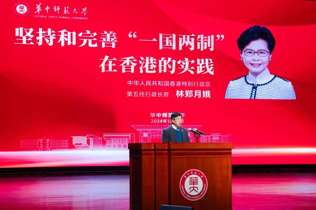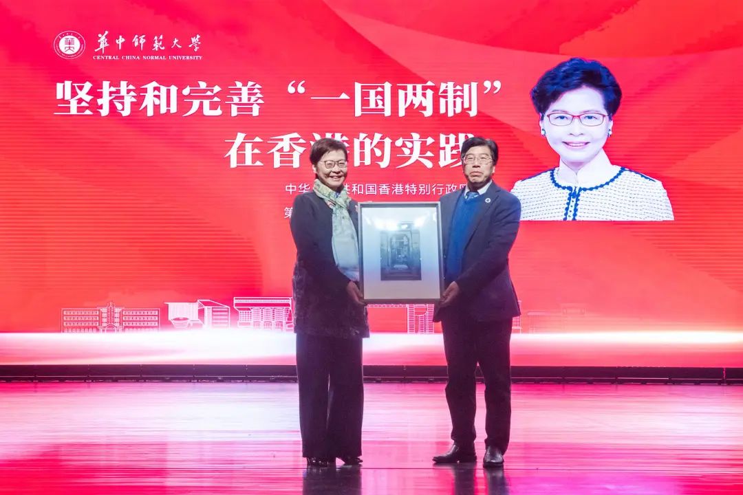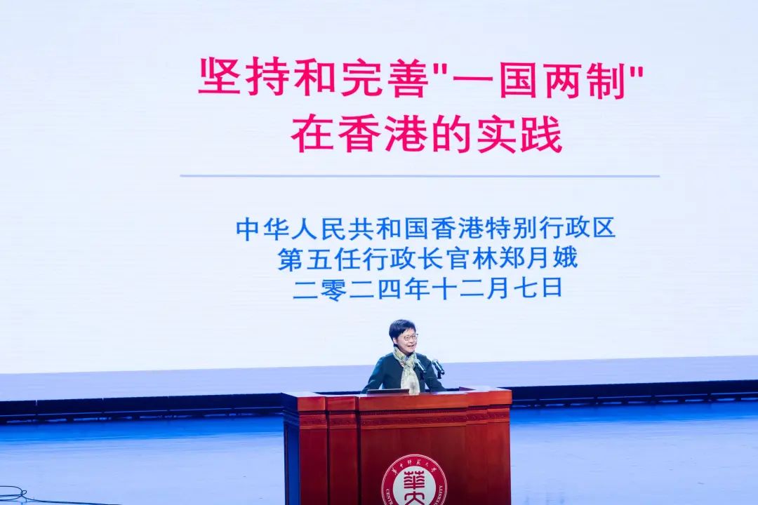 林郑月娥女士回顾了“一国两制”产生的历史背景和实践历程,分享了担任香港特区行政长官五年来,在中央支持下,依据《中华人民共和国宪法》和《香港特别行政区基本法》,带领香港战胜巨大挑战的实践。她表示,在中央大力支持下,香港正迈向由治及兴的新征程。面对机遇与挑战并存的新局面、新未来,香港要始终坚持“一国两制”原则,巩固并提升香港国际地位,发挥法治及司法权独立、普通法应用优势,提升传统经济领域的动力,积极发展新产业,拓展与国际和内地联系,巩固提升香港枢纽地位,用好中央支持,全力推动粤港澳大湾区发展,更好融入国家发展大局。林郑月娥女士还特别介绍了任内关于教育工作的理念和实践,以及香港特区政府推行的多项人才计划。她表示,教育是国家强盛、民族兴旺的希望所在,是培养人才的关键,希望同学们在培养下一代的教育工作中作出更大贡献,也欢迎更多优秀华师学子赴香港学习、工作、发展。