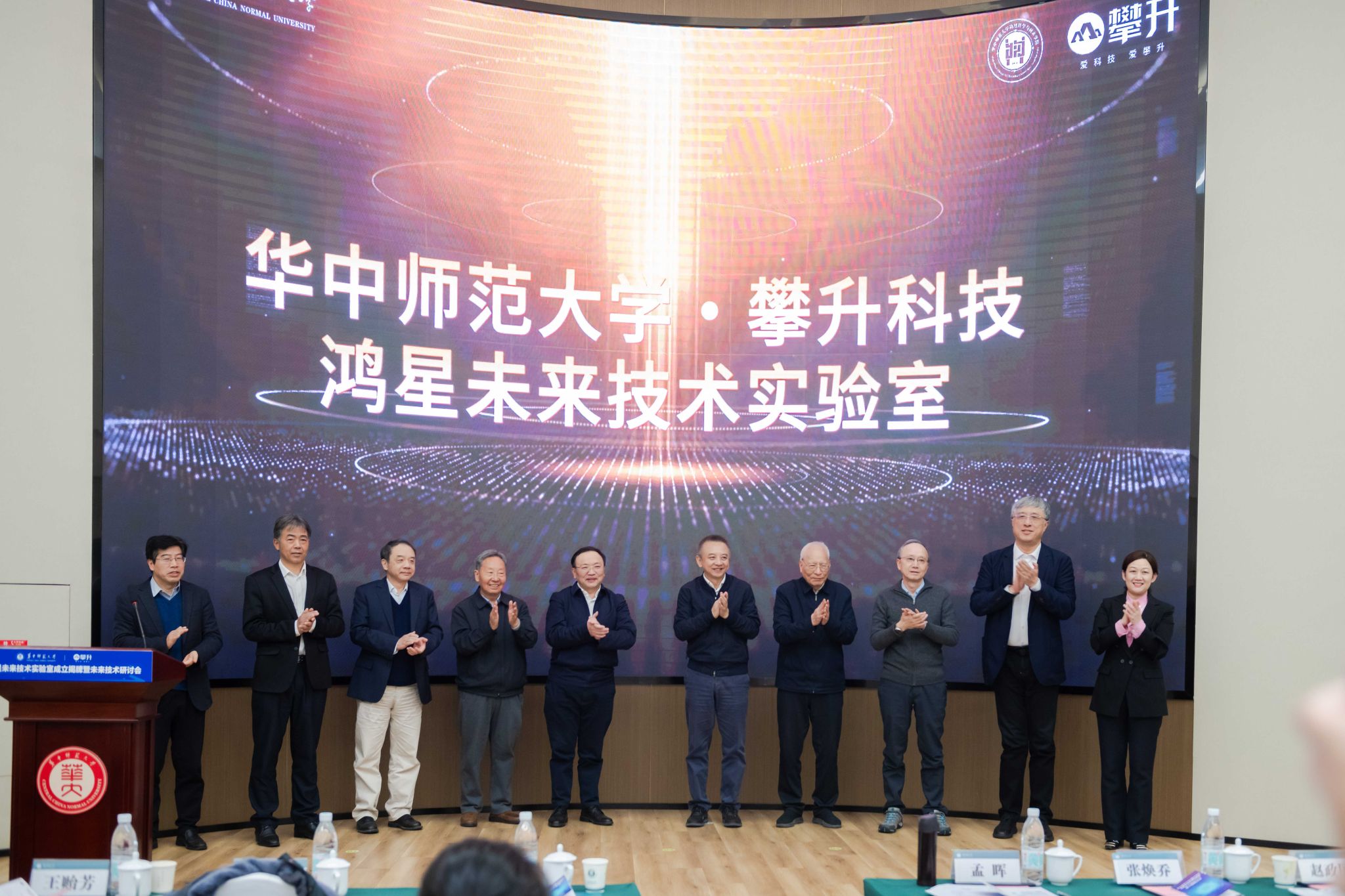 孟晖、何建文、夏立新、彭双阶、张焕乔院士、叶朝辉院士、赵政国院士、王贻芳院士、高原宁院士、马余刚院士共同为鸿星未来技术实验室揭牌
