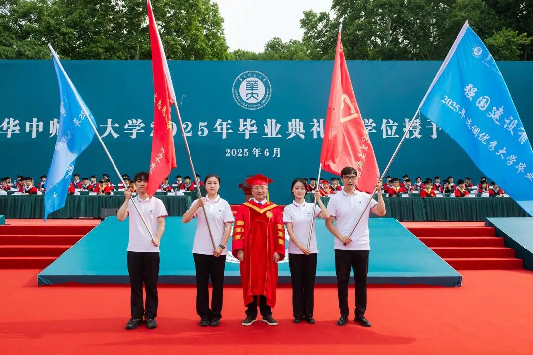 夏立新寄语2025届到西部、基层建功立业毕业生,“到祖国和人民最需要的地方发光发热”,并为“优师计划”、西部计划、研究生支教团、选调生毕业生代表授旗。学生代表们共同发出“强国建设有我”的铿锵宣言,也是华师人接续奋斗、报效祖国的铮铮誓言。