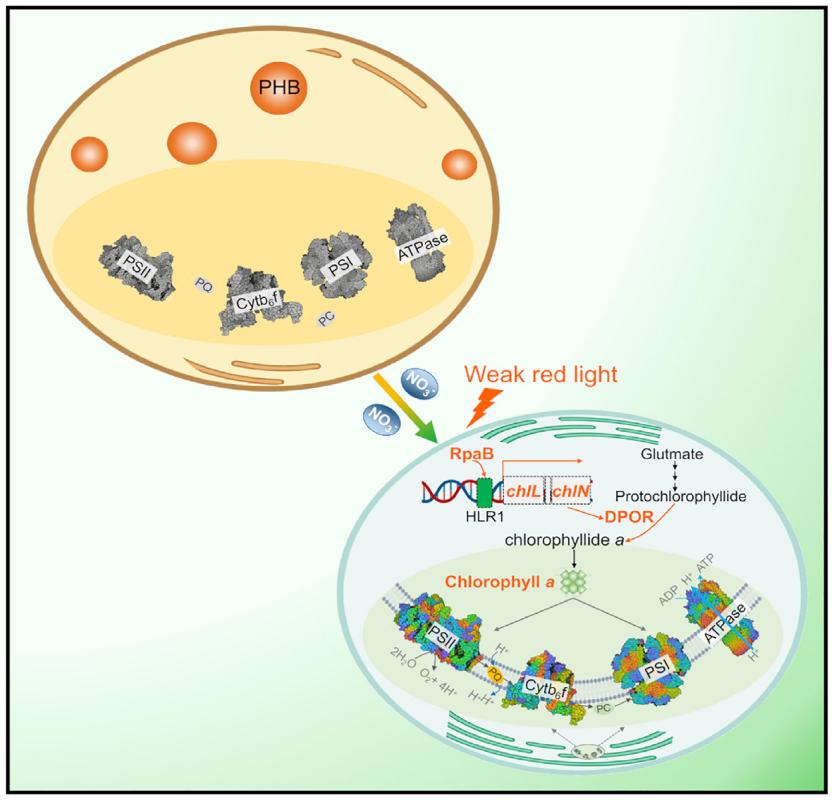 光合机构的“再造”是休眠蓝藻细胞成功复苏的关键过程,其中光合作用的生物发生与调控机制有许多未解之谜。该研究发现,在模拟浅水湖泊底部弱光条件下,缺氮休眠蓝藻的复苏效率具有光质偏好性,红光是休眠蓝藻成功复苏所必需的。转录组分析发现,红光能显著促进非光依赖性原叶绿素酸酯还原酶(DPOR)的表达,敲除DPOR亚基ChlL后蓝藻丧失弱红光下的休眠复苏能力,首次证明了DPOR在蓝藻复苏过程中的重要生物学功能。进一步通过转录因子筛选、转录因子与启动子的结合及活性区域分析,证实转录因子RpaB在调控chlL基因的表达与决定蓝藻成功复苏过程中发挥关键调控作用。