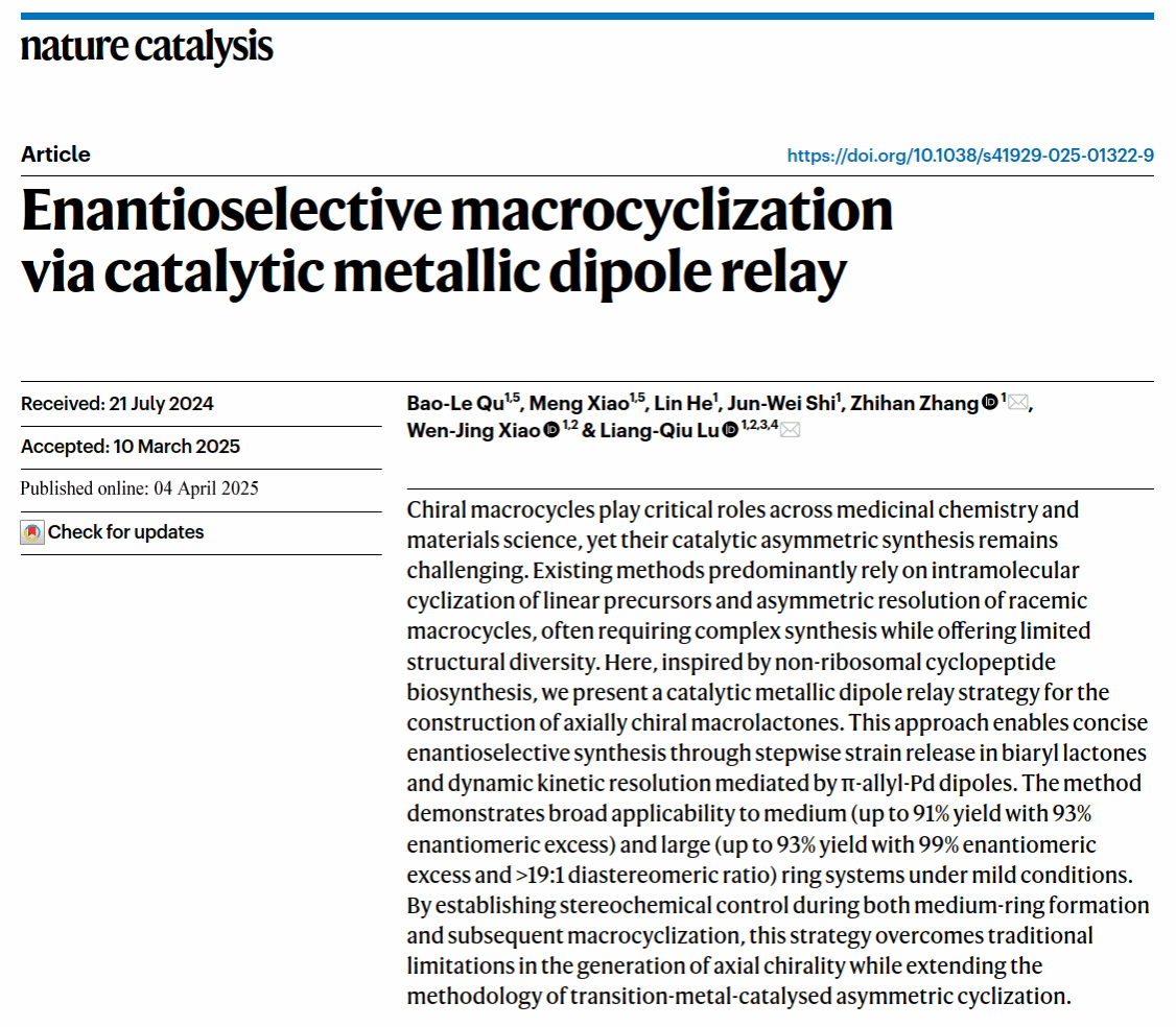 华大在线讯(通讯员 周汉鸣)4月4日,我校化学学院肖文精教授团队在国际顶级期刊《自然催化》(Nature Catalysis)发表题为"催化的金属偶极体接力实现对映选择性大环化"(Enantioselective macrocyclization via catalytic metallic dipole relay)的研究论文。该研究创新性地提出了"金属偶极体接力"策略,为轴手性大环化合物的高效合成开辟了新路径。开云网页版登录入口博士研究生曲宝乐(实验研究)和肖萌(理论计算)为共同第一作者,陆良秋教授和张之涵教授为共同通讯作者,我校为第一完成单位。