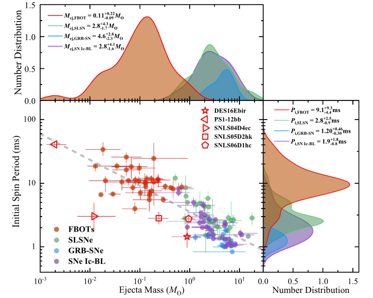 俞云伟教授领导的课题组曾于2015年率先提出了FBOT的毫秒磁陀星能源模型,并在随后数年内探讨了多种可能的磁陀星形成通道。在此次研究工作中,他们进一步基于PS1-DMS、DES-SN、SNLS、HCSSP以及PTF各大暂现源巡天观测项目的观测结果,实现了对FBOT较大样本的批量拟合和统计分析,从而发现了FBOT磁陀星旋转周期和爆发抛射物质量之间的反相关关系,并据此揭示了FBOT和超亮超新星、宽线Ic型超新星以及伽马暴成协超新星之间的紧密联系(如图1所示)。基于现有的恒星演化模拟结果,Mej-Pi反相关关系预示着这几类特殊的极端恒星爆发现象可能均源自于致密星-恒星双星系统,致密星伴星对不同类型恒星的潮汐作用是导致极端爆发的主要原因,这位最终揭示FBOT的起源提供了重要线索和方向。
